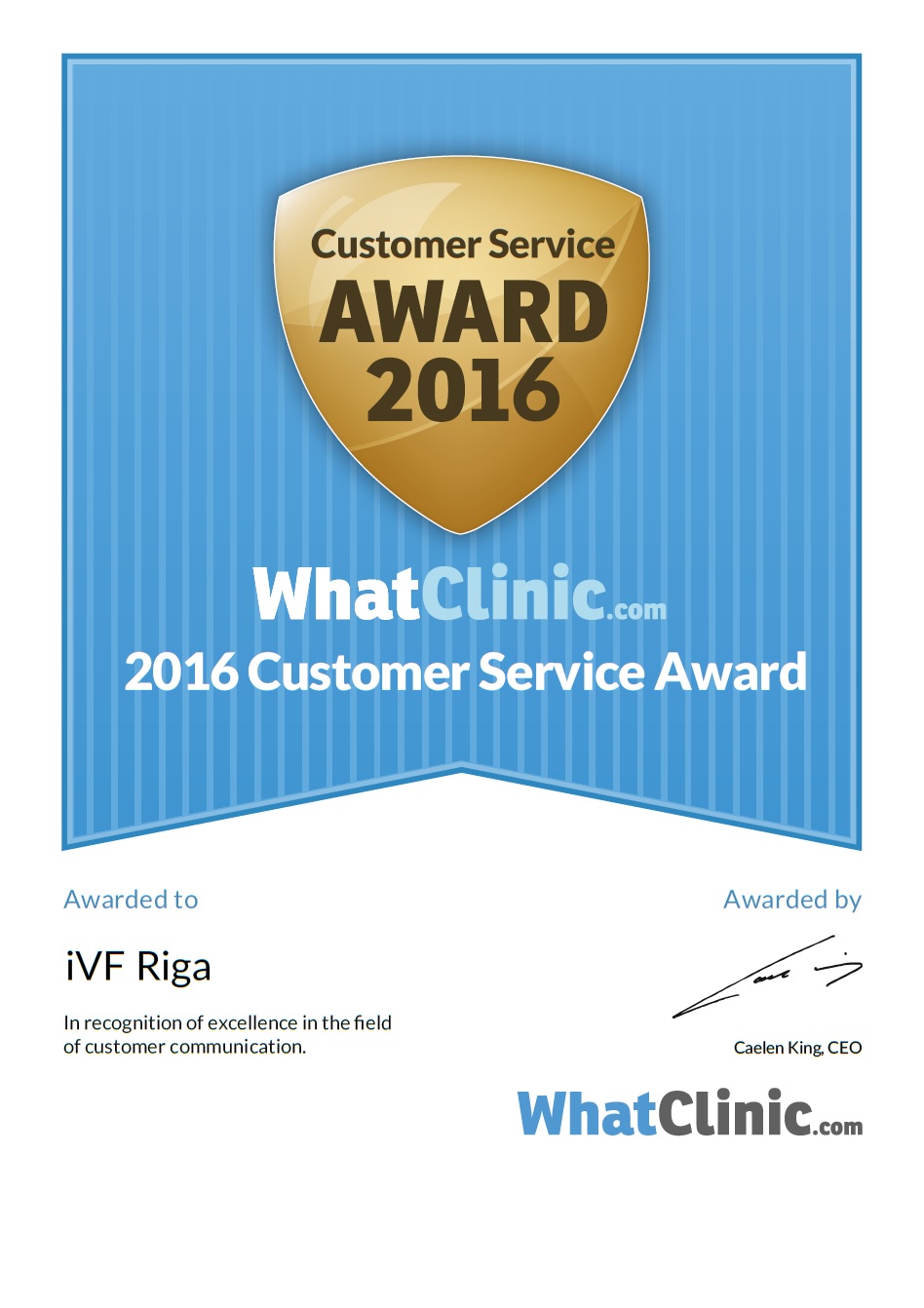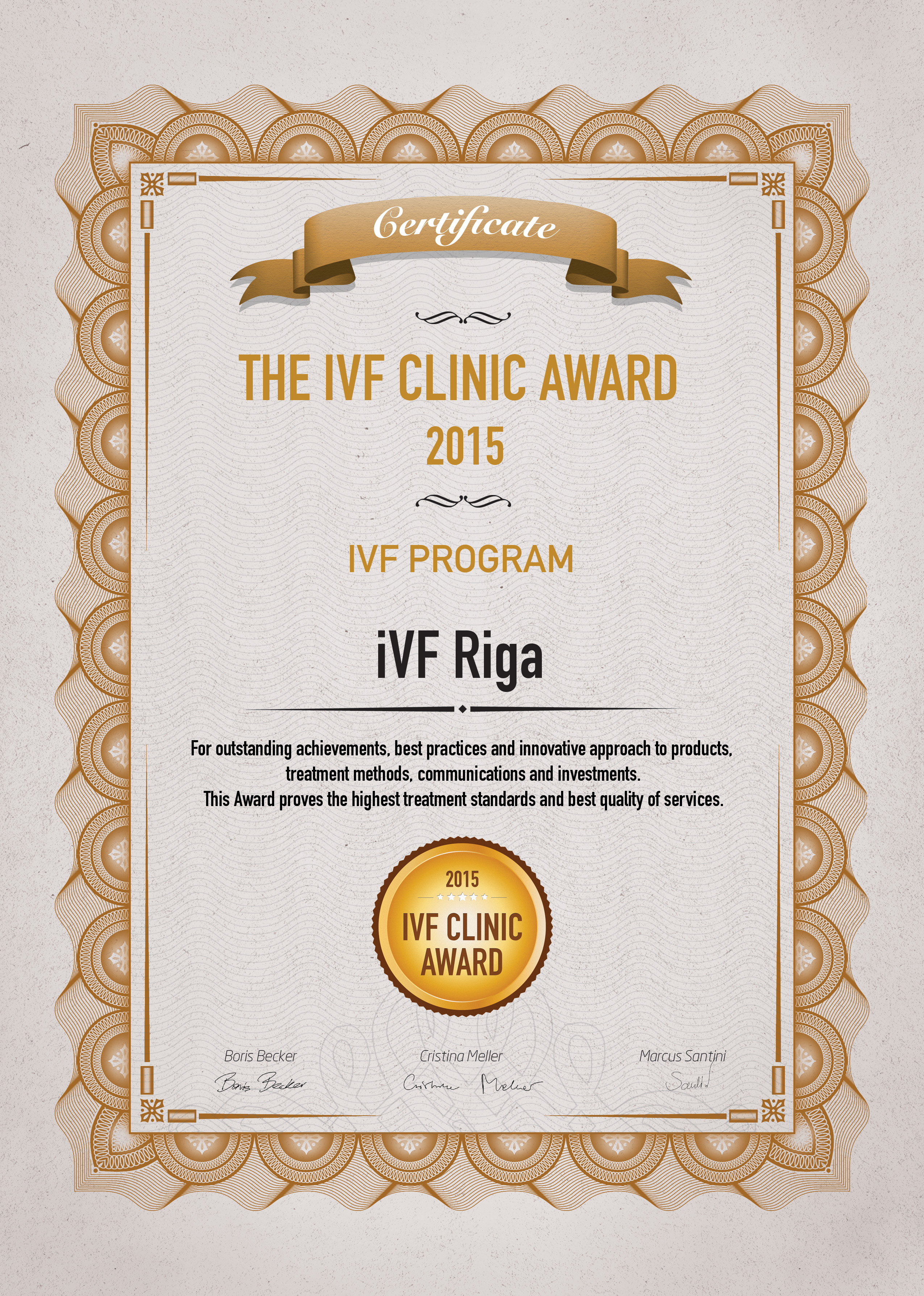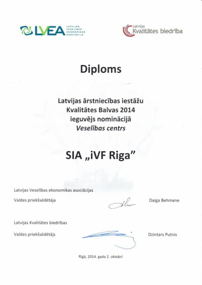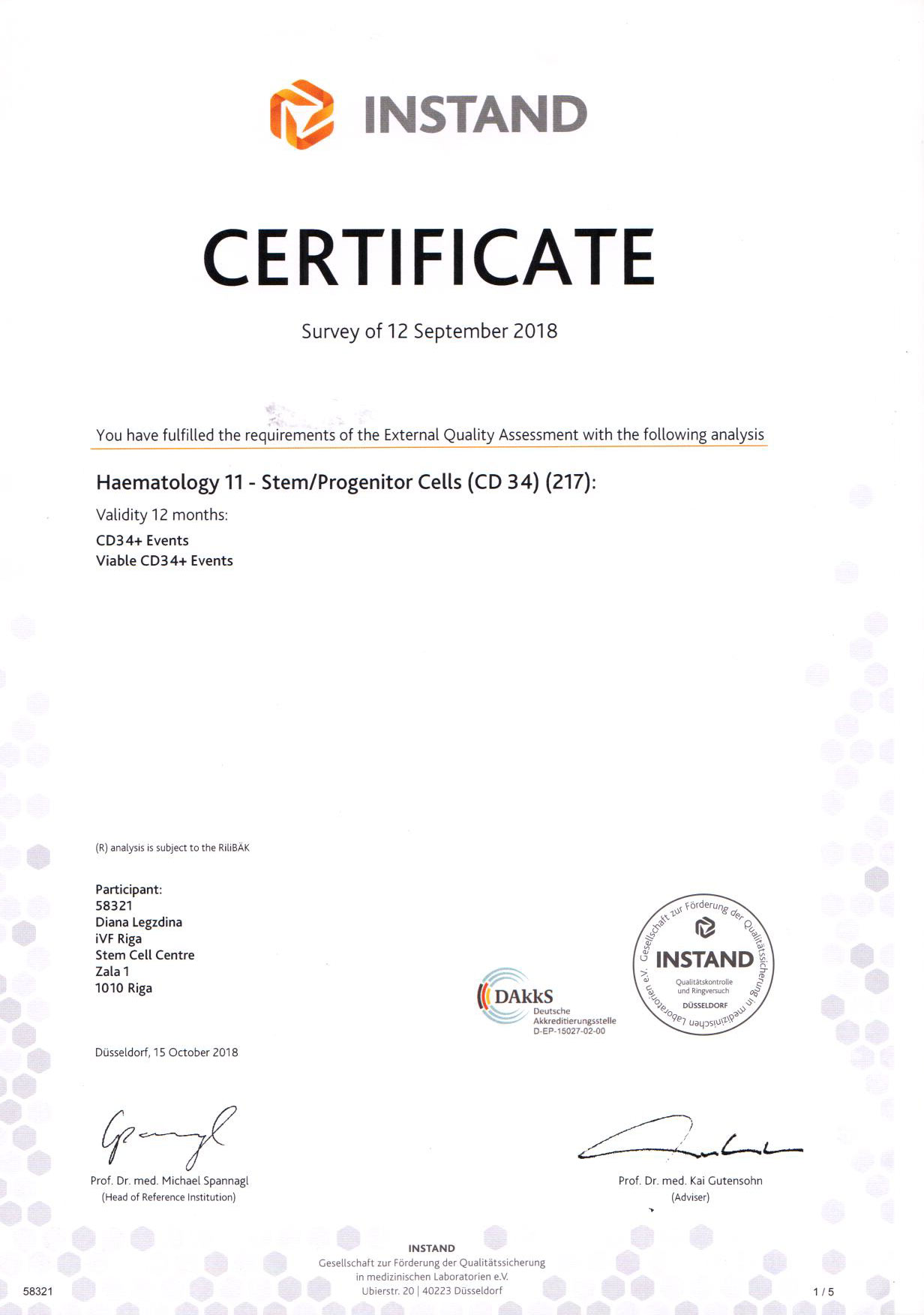2018.gada 12. septembrī iVF Riga Cilmes šūnu centra laboratorija veica ārējo kvalitātes kontroli hematopoētisko cilmes šūnu (CD34+ šūnu) analīzei ar plūsmas citometrijas metodi. Hematopoētisko cilmes šūnu (CD34+) raksturošanai bija nepieciešams aprēķināt cilmes šūnu koncentrāciju asinīs, kā arī noteikt to dzīvotspēju. iVF Riga Cilmes šūnu centra laboratorija ir izpildījusi ārējās kvalitātes kontroles prasības pēc šiem kritērijiem un ieguvusi sertifikātu, kas apliecina, ka laboratorija spēj kvalitatīvi veikt hematopoētisko cilmes šūnu (CD34+ šūnu) analīzi. Sertifikātu izsniedza vācu kompānija INSTAND, kas nodrošina kvalitātes kontroli medicīnas laboratorijām, un tas ir derīgs vienu gadu.